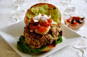 The burger itself is a simple combination of quinoa, bread crumbs and mushrooms with the binder being mashed yams. The burger still fell apart a little so next time I would probably add a flax egg (2 tbsp ground flax seed whisked with 5 1/2 tablespoons of water – refrigerate 10 minutes or more to thicken), or more mashed yams. But at the end of the day, it didn’t matter. Messy, supremely delicious and healthy to boot. What more could you ask for? Hope you enjoy this quinoa burger as much as I did.