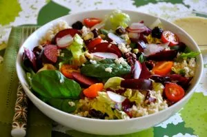 Farro, quinoa or barley or a combination of all is the foundation. In another bowl, I start assembling my summer salad with greens like Boston lettuce, kale, and spinach.